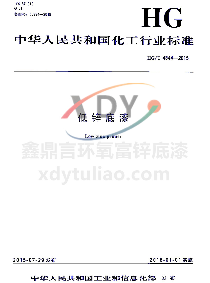 ICS 87.040 G51 備案號:50884-2005 HG 中華人民共和國化工行業(yè)標(biāo)準(zhǔn) HG/T 4844-2015 低鋅底漆Low zinc primer 2015-07-29發(fā)布 2016-01-01實(shí)施 中華人民共和國工業(yè)和信息化部 發(fā)布 本標(biāo)準(zhǔn)規(guī)定了低鋅底漆的產(chǎn)品分類、要求、試驗(yàn)方法、檢驗(yàn)規(guī)則、標(biāo)志、包裝和貯存。本標(biāo)準(zhǔn)適用于不揮發(fā)分中金屬鋅含量低于60%但不低于40%的低鋅涂
