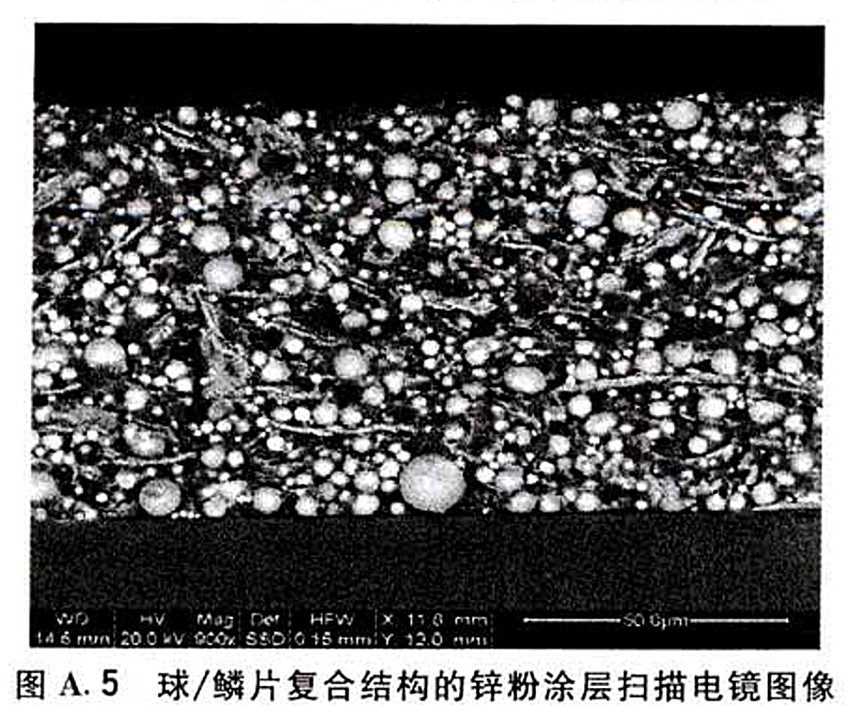 圖A.5 球/鱗片復(fù)合結(jié)構(gòu)的鋅粉涂層掃描電鏡圖像