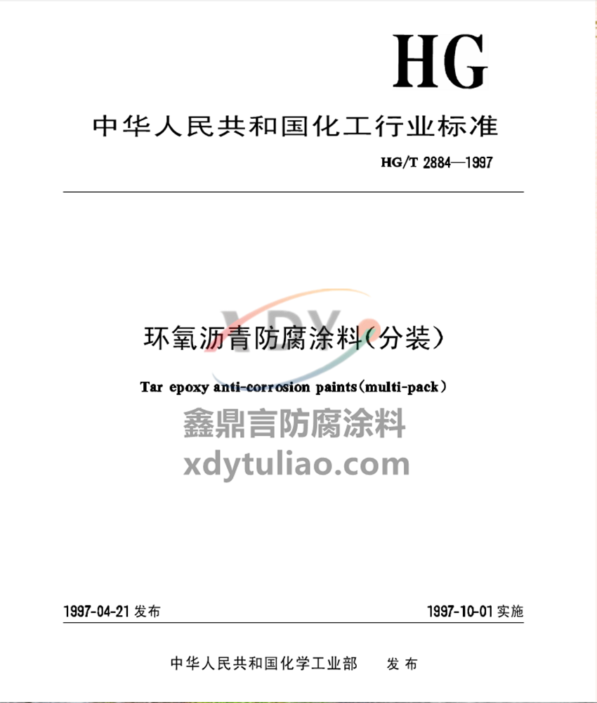 環氧瀝青防腐涂料(分裝)標準HG/T2884-1997:本標準規定了環氧瀝青防腐涂料(分裝)產品的要求、試驗方法及標志、標簽、包裝。本標準適用于以環氧樹脂、煤焦瀝青為漆基,加入顏料、體質顏料、溶劑、助劑及固化劑而制成的雙組份環氧瀝青漆底、面漆配套的防腐涂料(包括普通型和厚膜型兩類)。該涂料主要用于水下及地下鋼結構的重防腐涂裝。